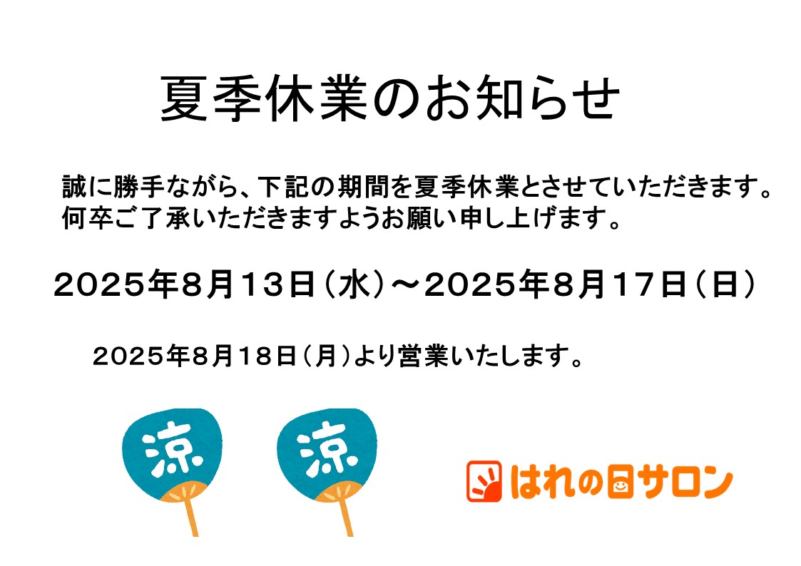 2025年8月12日 / 最終更新日時 : 2025年8月12日 harenohi-admin01 お知らせ 夏季休業のお知らせ 明日から夏季休業をいただきます。お間違えのないようよろしくお願いいたします。