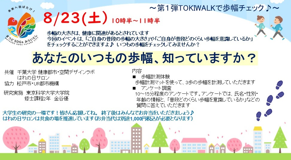 2025年8月19日 / 最終更新日時 : 2025年8月19日 harenohi-admin01 イベント情報 歩く幅、意識していますか?大学生の研究を行います♪ぜひお越しくださいね! 今週の土曜は、大学生の研究の一環で「TOKIWALK~歩幅計測体験」が行われます! みなさんは歩き方に普段意識されていますか? この体験を通して、健康意識が高まった!という方も多くいらっしゃいます。 午前中、お友達を誘ってぜひこの機会に体験してみてください♪ 日時:8月23日(土)10:30~11:30 参加費:無料(なるべくご予約ください!)※簡単なアンケートにご協力ください #はれの日サロン #千葉大学 #TOKIWALK #歩幅計測体験 #健康的なまちづくり #千葉大学健康都市空間デザインラボ #大学生の研究 #介護予防 #健康寿命を延ばそう